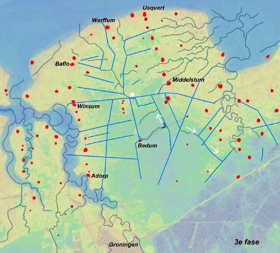 In het noord-oostelijk deel van het Centrale Woldland werd de waterafvoer in oostelijke richting verbeterd door de aanleg van het Westerwijtwerdermaar (witte pijlen rechts op het kaartje dichtslibben Fivel). Ten oosten van de Fivel is tevens de westelijke aanzet van de Delf ingetekend.